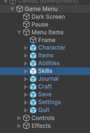 Open Game Menu prefab, duplicate one of the menu items, name it “Skills”, click on it and in the inspector set the action to “Open Skills”!
