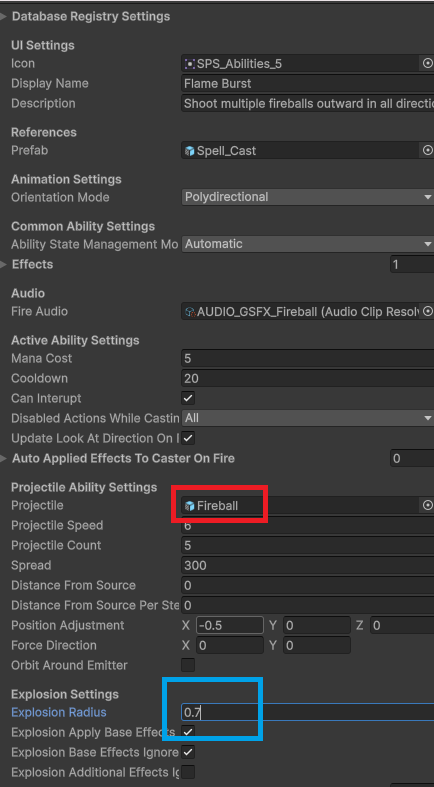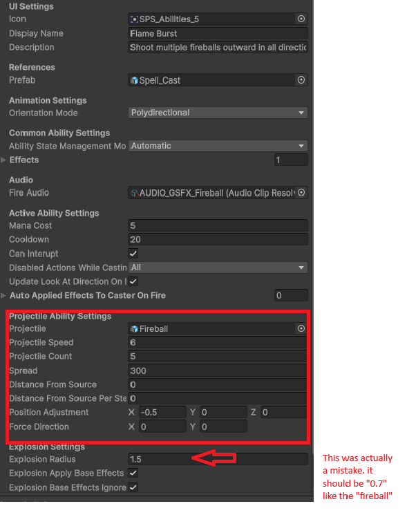 - Fire blast not hitting enemies -> change the “Projectile property from “meteor” to “fireball”