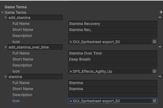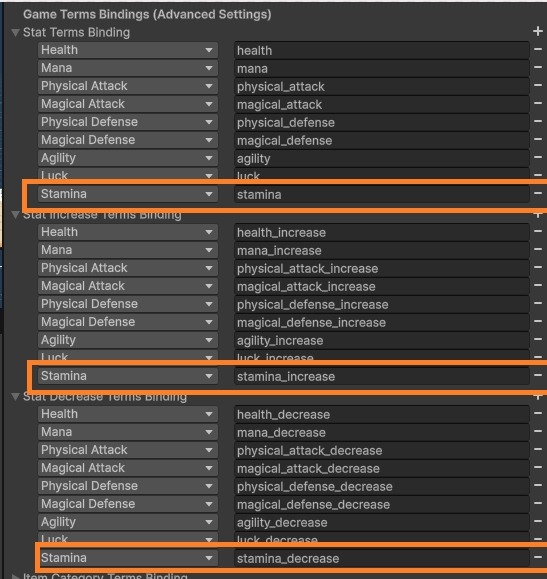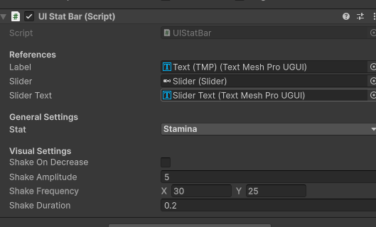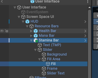 For the UI, just open the prefab “User Interface”, inside of “HUD->Resources Bars” duplicate one of the bars and change it’s name to “Stamina Bar”. In the inspector, change the stat to Stamina [image in attachment] Also, change the “Stamina Bar->Slider->Fill Area-> Fill” background image to the green one [image in attachment]