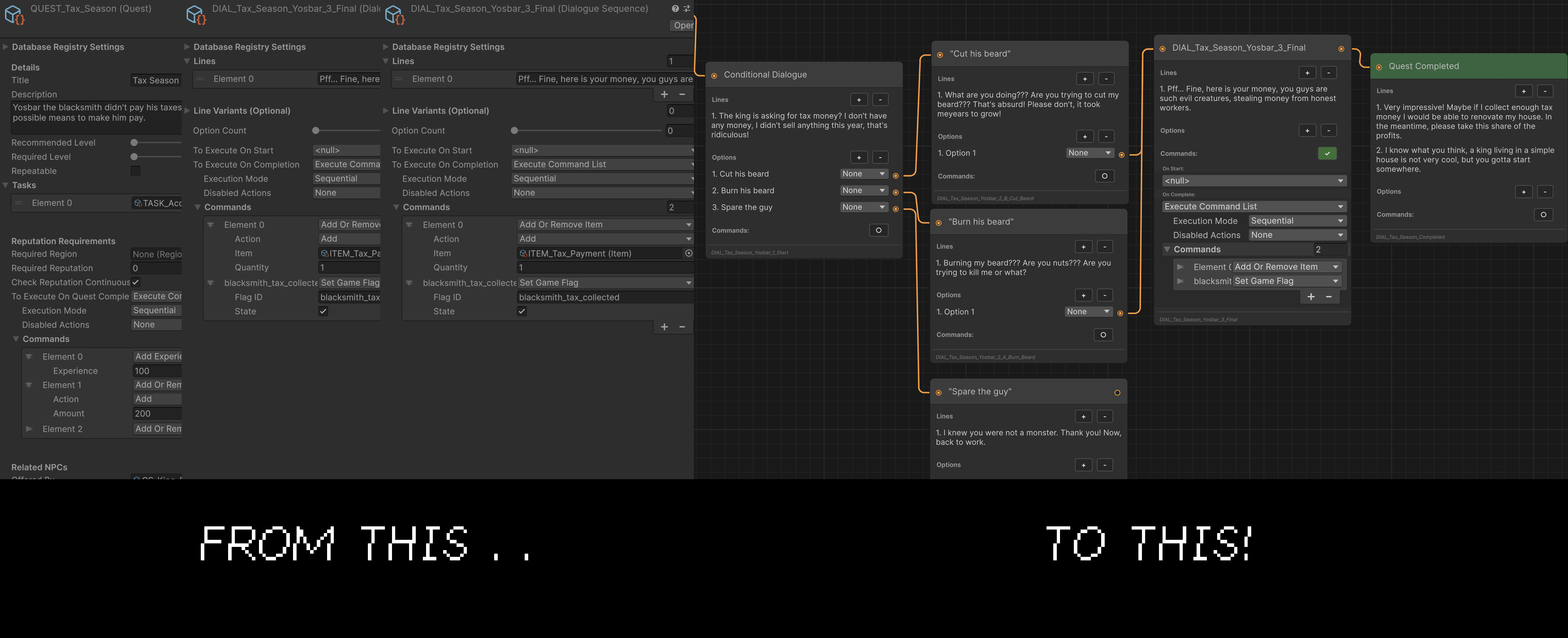 Everything at a glance, with the Visual Quest Editor Window! Create Quests faster: Create all your quest files and attach them in the visual editor Cleaner File Structure: For new quests created, all DIAL_ and TASK_ SOs are found collapsed in the QUEST_ file). **Easy editing: **Changing the quest title on the info node will rename EVERY file to fit the new quest name. You can adjust all text by double clicking it on the node. You can also manually adjust each file name by clicking the file name on the bottom of the node. NPC Interaction Editing You can add and adjust Conditional Commands on NPC prefabs for quests with the Conditional Command node straight in the visual editor